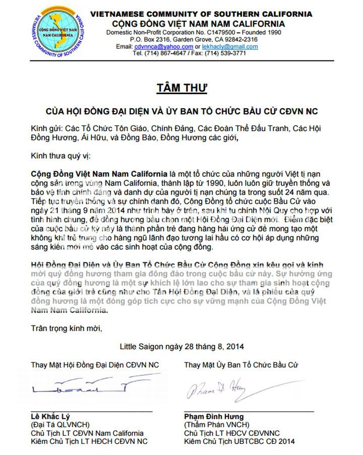 Hội Đồng Đại Diện Cộng Đồng VN Nam California, nhiệm kỳ 2014 - 2017: với thành phần như sau: Hội Đồng Chấp Hành gồm: