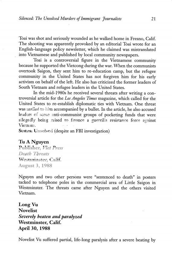 Hãng phim "Terror in Little Saigon" phản biện và thách đố đảng Việt TânChữ "Little Saigon" đã từng được xử dụng trong cuốn sách của "CPJ" vào năm 1994Little Saigon ngày 16 tháng 11 năm 2015Kính thưa Quý Đồng Hương,Trong các bài viết của tôi trong thời gian vừa qua, tôi có trình bày rằng theo tôi nghĩ là cuốn phim Terror in Little Saigon không hề có ý nhục mạ hay chụp mũ Cộng Đồng khi dùng chữ "Little Saigon," nay tôi muốn chứng minh bằng chứng là vào tháng 12 năm 1994, Ủy Ban Bảo Vệ Các Nhà Báo Tự Do (Committee to Protect Journalists-CPJ) có phát hành cuốn sách "Silenced The Unsolved Murders of Immigrants Journalists in the United States," mà trong đó có đề cập đến chữ "Little Saigon" liên quan đến các án mạng trong cộng đồng người Mỹ gốc Viêt. Trong quyển sách này, "CPJ" chẳng những đề cập đến 5 cái chết của người Việt Nam, mà còn đề cập đến nhiều ký giả Việt Nam khác nữa cũng bị tấn công thương tích và đe dọa tính mạng, mà trong đó có nhắc đến việc ông Đỗ Ngọc Yến, chủ bút báo Người Việt từng bị hăm dọa tử hình vì cho rằng ông Đỗ Ngọc Yến liên hệ với Việt cộng.Nêu lên vấn đề trên, tôi không chủ trương binh vực hay bảo vệ cuốn phim "Terror in Little Saigon," tôi chỉ muốn chứng minh là chữ "Little Saigon" đã từng được "CPJ" nêu lên từ tháng 12 năm 1994, trước khi cuốn phim "Terror in Little Saigon" ra đời vào tháng 11 năm 2015. Tôi muốn hỏi đảng Việt Tân và những ai đang lên án ký giả A.C. Thompson và nhà sản xuất phim "Terror in Little Saigon" đã xữ dụng chữ "Little Saigon," tại sao không phản đối Ủy Ban Bảo Vệ Các Nhà Báo Tự Do "CPJ" vì họ cũng đã từng xữ dụng chữ "Little Saigon" trong cuốn sách tứ năm 1994?Xin quý vị coi các bằng cớ trong cuốn sách của "CPJ" ở dưới để thấy điều tôi muốn trình bày. Xin quý vị lưu ý các chỗ có khung màu đỏ để dễ thấy. Tôi sẽ trình bày về vấn đề kế tiếp sau khi quý vị xem qua một phần chính yếu cuốn sách của "CPJ" này.PDF]silenced: The Unsolved Murders of immigrant journalists in ...